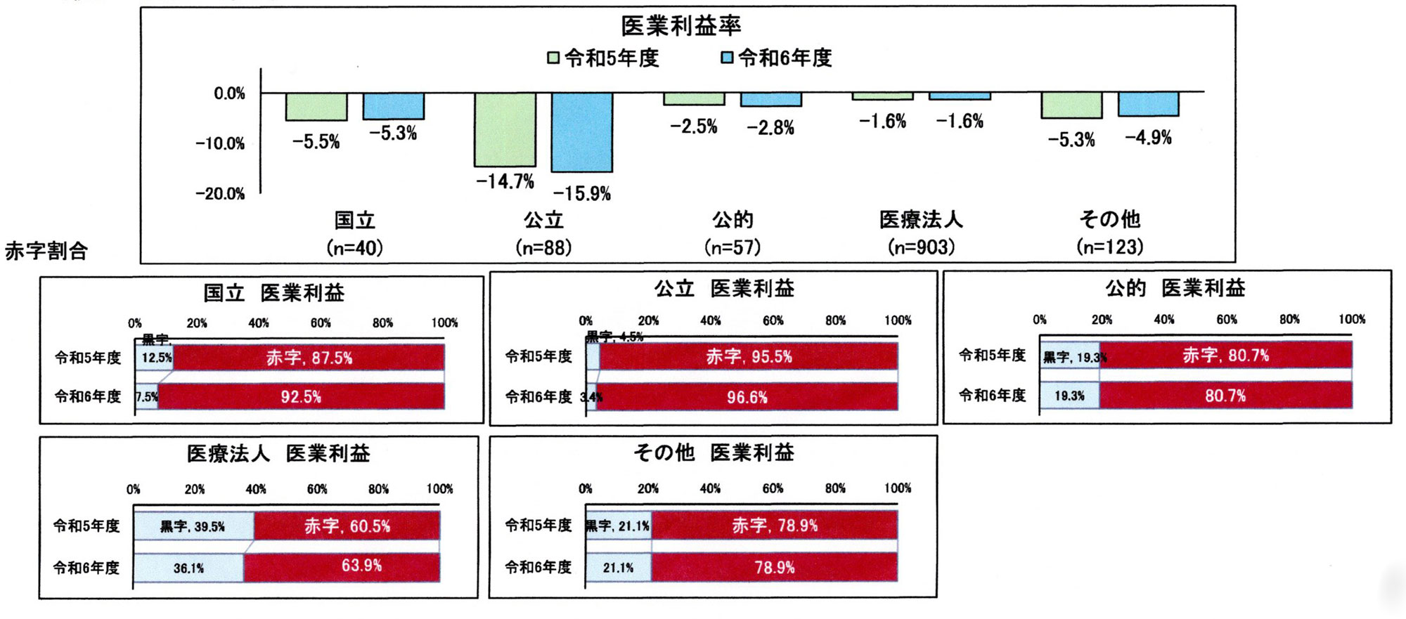 医業利益の赤字割合も、国立で92.5%、公立で96.6%、医療法人で63.9%となり、極めて厳しい経営状況にあるといえます。