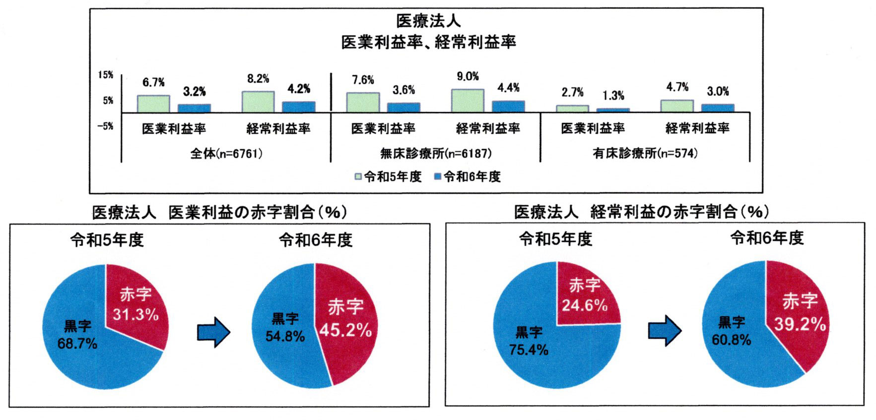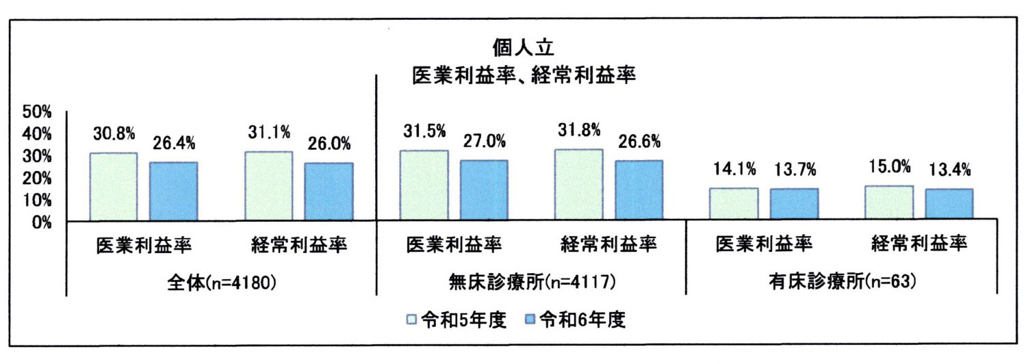 以上のことから、医業収益率および経常利益率において、一般病院は赤字、一般診療所は黒字ということが確認されました。一般診療所の中で圧倒的に数の多い個人の診療所の赤字率が不明であったため、診療所全体の経営状況は不明瞭な結果でした。