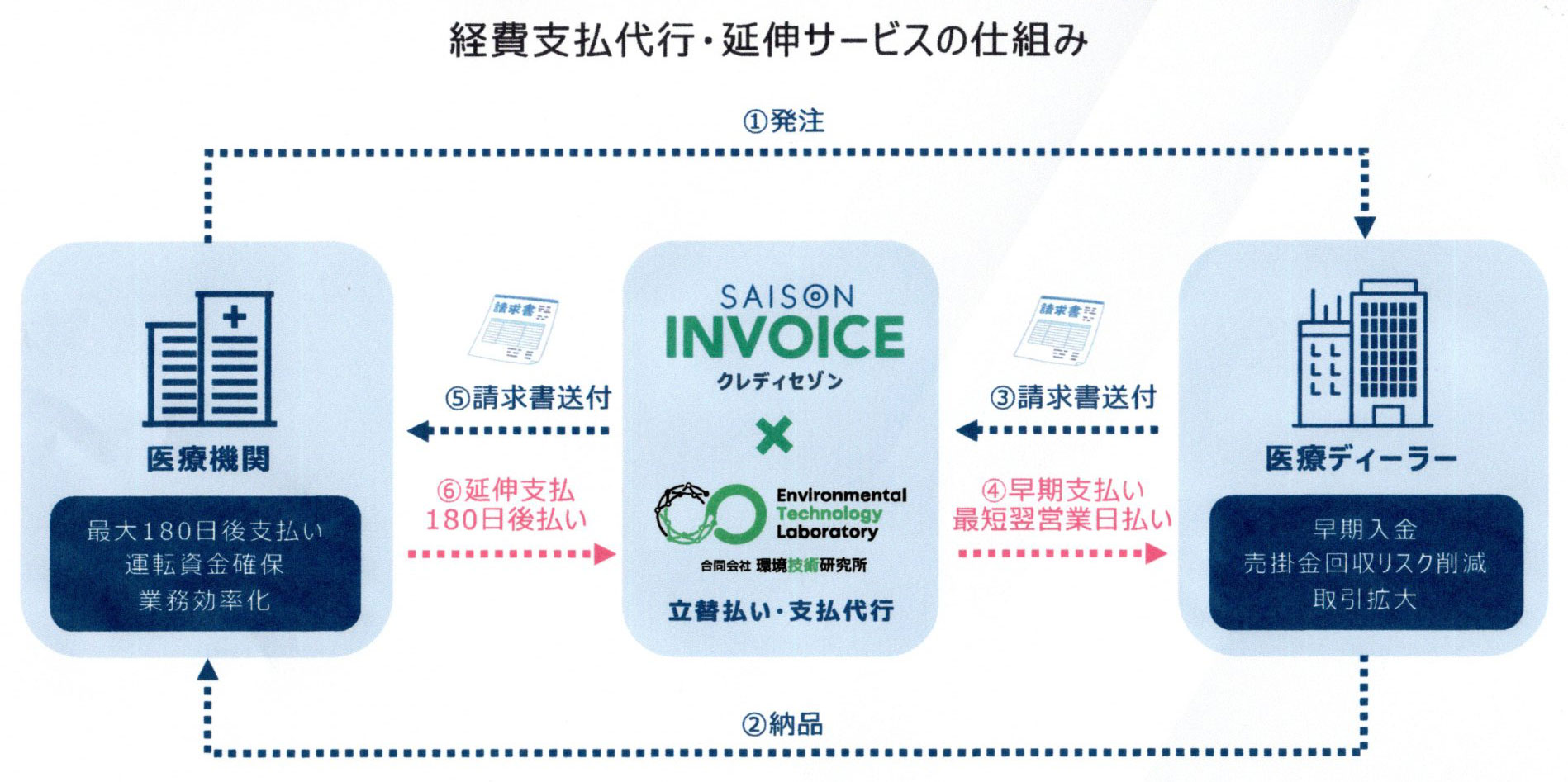 このような現状の中、運営資金のやりくりの方法として、クレジット会社(株式会社クレディセゾン)による医療機関への支払い代行・繰延サービスが提供されています(下図)。